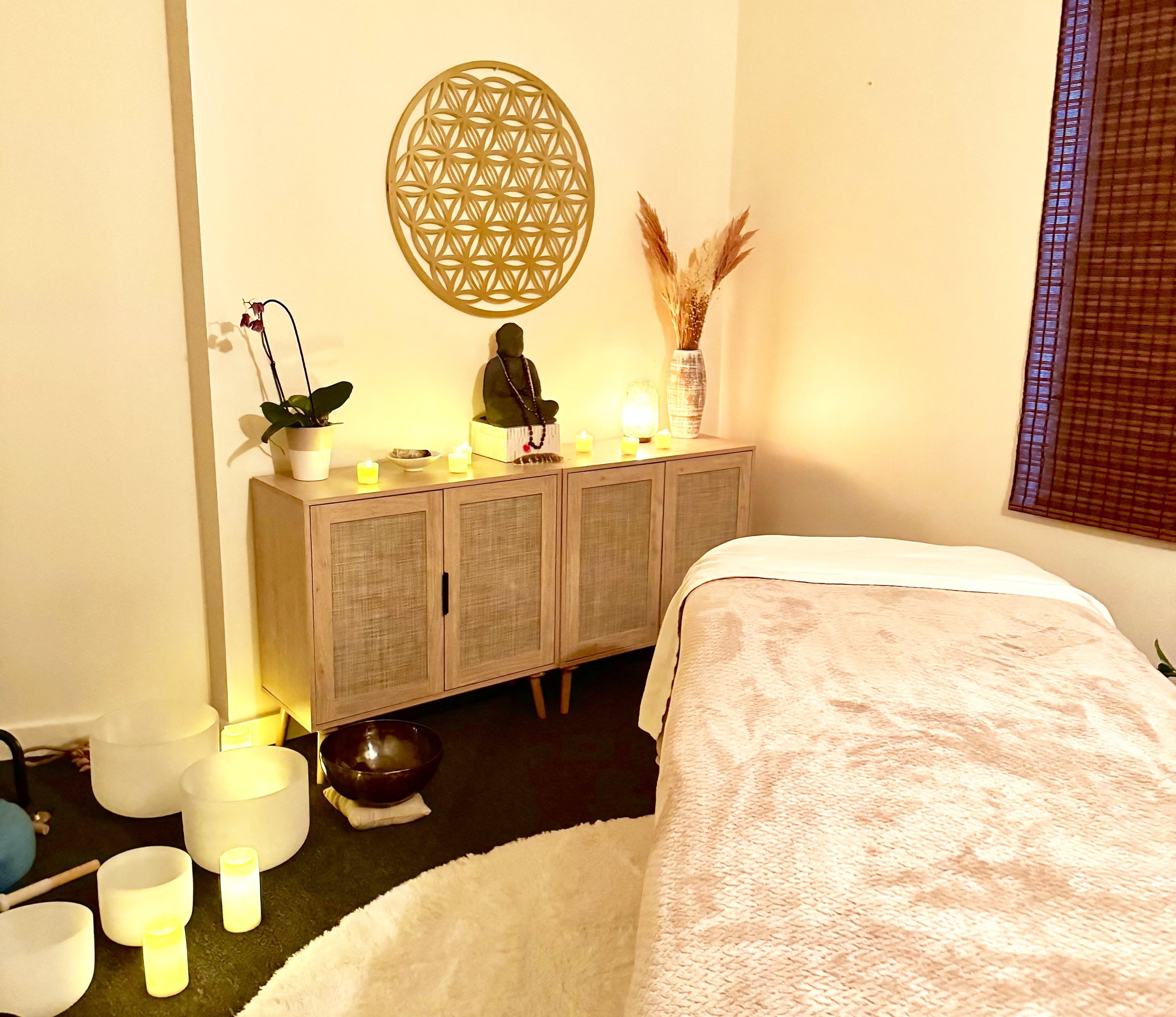 In my Studio, you will find an intimate healing space created for stillness and renewal. The room offers a grounded, nurturing atmosphere where you can exhale and simply be.